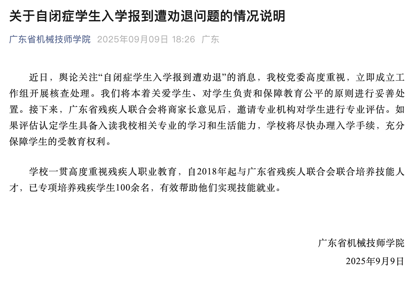 近日,舆论关注“自闭症学生入学报到遭劝退”的消息,我校党委高度重视,立即成立工作组开展核查处理。我们将本着关爱学生、对学生负责和保障教育公平的原则进行妥善处置。接下来,广东省残疾人联合会将商家长意见后,邀请专业机构对学生进行专业评估。如果评估认定学生具备入读我校相关专业的学习和生活能力,学校将尽快办理入学手续,充分保障学生的受教育权利。